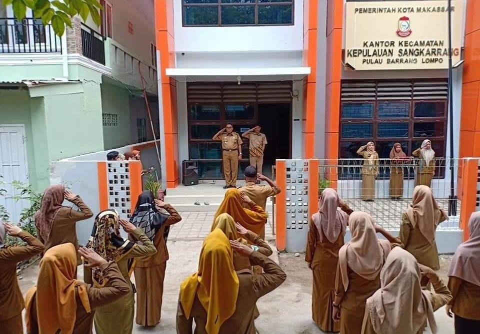 WAHANA INFOTA – Camat Kepulauan Sangkarrang H.Akbar Yusuf kembali menjadi Inspektur pada pelaksanaan Upacara di Halaman Kantor Camat Kepulauan Sangkarrang Pulau Barrang Lompo, Senin (1/7/19).