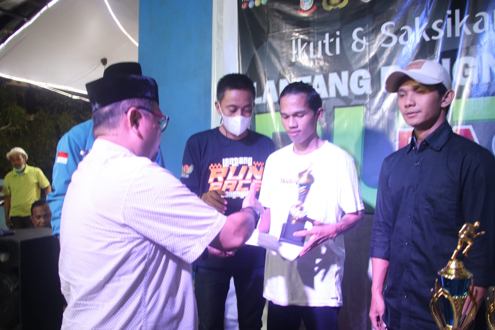 WAHANA INFOTA, MAKASSAR — Camat Rappocini, Syaruddin, menyerahkan hadiah berupa Piala serta Uang Pembinaan kepada para pemenang Lantang Bangngia Run Race tingkat kecamatan Rappocini, Selasa (26/04/2022).