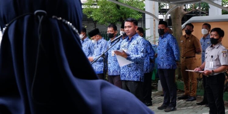 Camat Ujung Pandang Syahrial Syamsuri Memimpin langsung Apel Pagi wilayah se-kecamatan di halaman kantor, Senin (17/1/2022). Dalam Apel Pagi di hadapan ASN kecamatan dan kelurahan, berpesan untuk mensukseskan program Walikota Makassar tentang disiplin Pegawai.