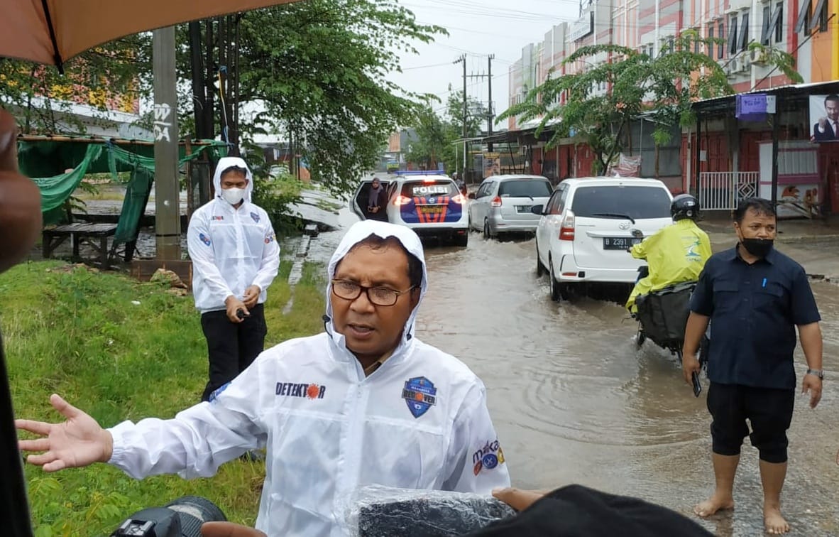 Menggunakan jaket parasut, Wali Kota Danny turun melihat genangan air yang sudah mulai terlihat itu.