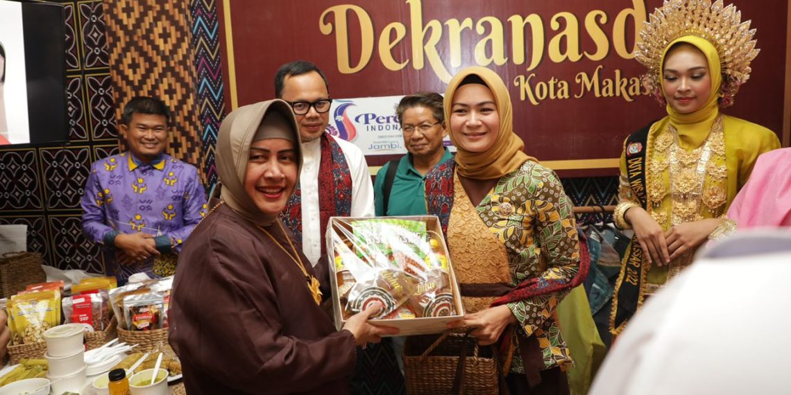 JAMBI – Sarasehan isteri Wali Kota Se Indonesia, digelar di Kota Jambi. Ketua TP PKK Kota Makassar yang juga Ketua Dekranasda Kota Makassar, Indira Yusuf Ismail memperkenalkan berbagai produk unggulan kota Makassar.