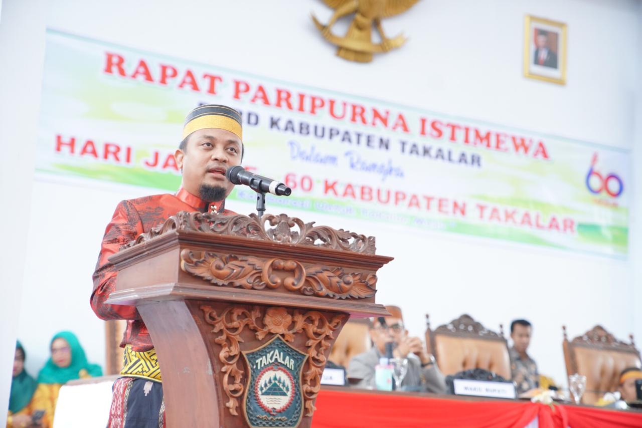 WAHANA INFOTA — Mengenakan pakaian adat, jas tutup didominasi warna merah disertai lipa’ sabbe dan songkok to Bone, Wakil Gubernur Sulawesi Selatan (Sulsel) Andi Sudirman Sulaiman, menghadiri rapat paripurna istimewa dalam rangka Hari Jadi Kabupaten Takalar ke 60 tahun, di DPRD Takalar, Senin (10/2). Andi Sudirman menyampaikan permohonan maaf atas nama Gubernur Sulsel, Nurdin Abdullah, yang berhalangan hadir.