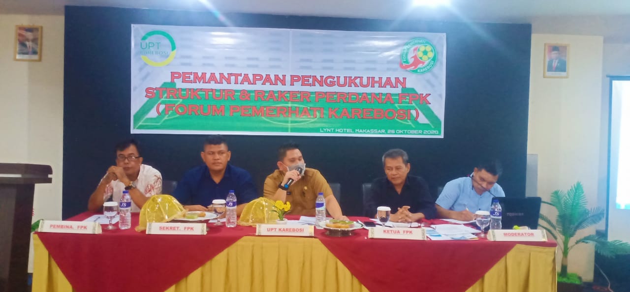 WAHANAINFOTA, MAKASSAR – Bangun kekompakan antara pengguna lapangan karebosi dan Forum Pemerhati Karebosi (FPK), Dispora Kota Makassar melalu UPT Karebosi bersama menggelar pemantapan Pengukuhan Struktur dan Raker Perdana di Hotel Lynt, Senin (28/10/2020)