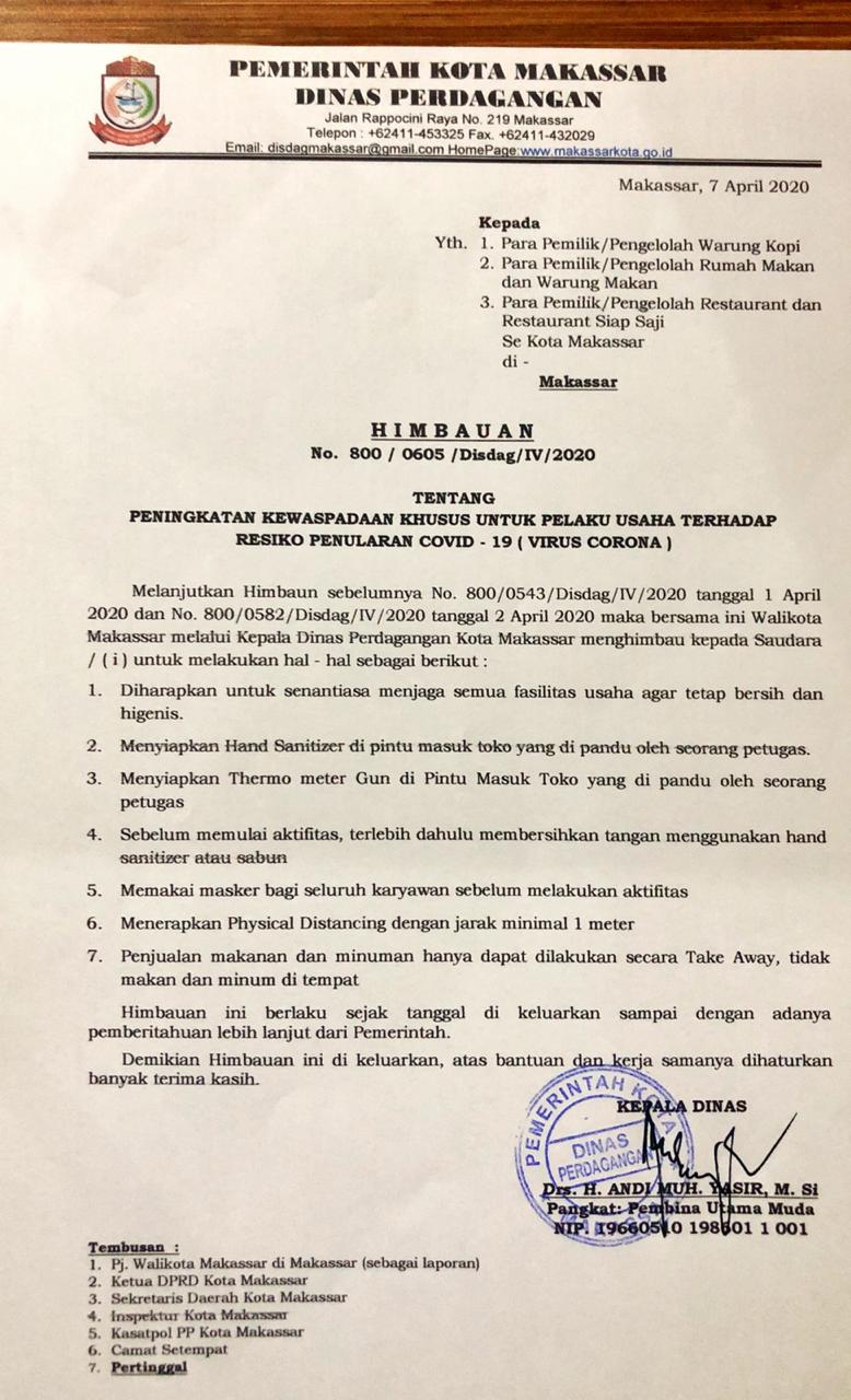 “Kami himbau pelaku usaha kuliner tidak lagi melayani makan dan minum di tempat. Pemesanan hanya untuk dibawa pulang (take away), dan pesan antar,” kata Kepala Dinas Perdagangan Kota Makassar A M Yasir (7/04).