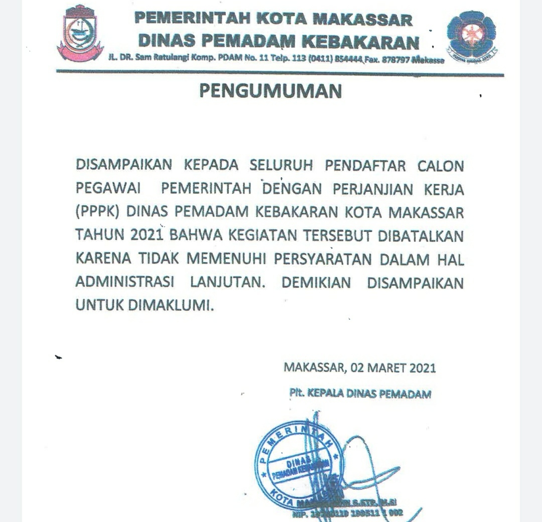 1. Tidak ada Surat resmi dari bidang kepegawaian yakni BKPSDMD Kota Makassar ke Dinas Pemadam Kebakaran Kota Makassar untuk melaksanakan penerimaan pegawai kontrak.