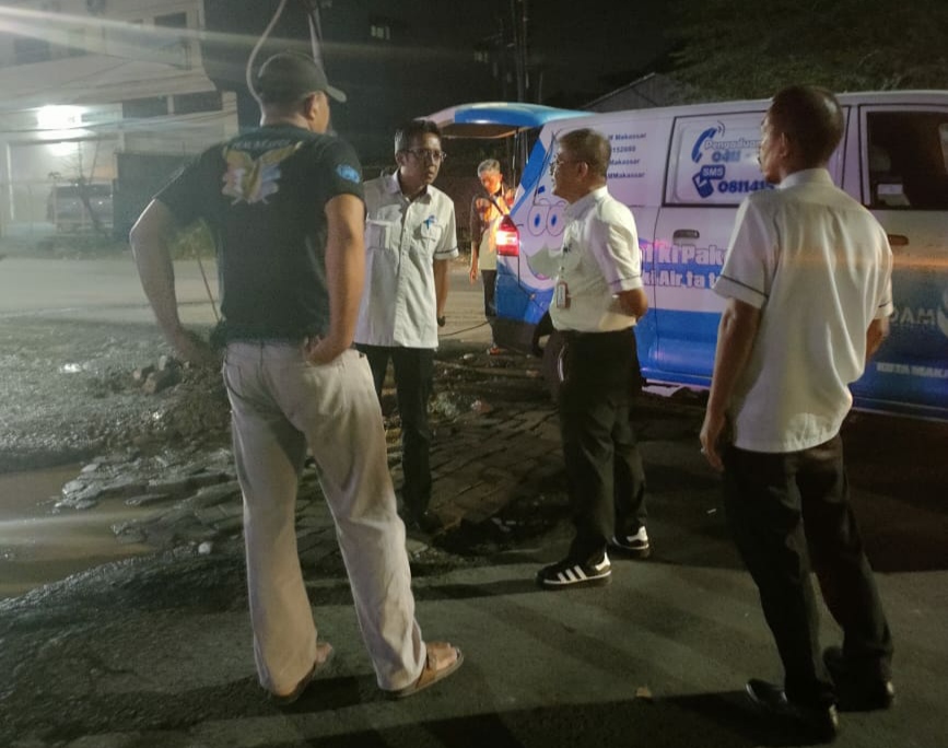 WAHANA INFOTA, MAKASSAR – Malam tak menyurutkan semangat para petugas tehnik lapangan Perumda Air Minum Kota Makassar dalam penanganan masalah distribusi dan Supply air ke palanggannya.