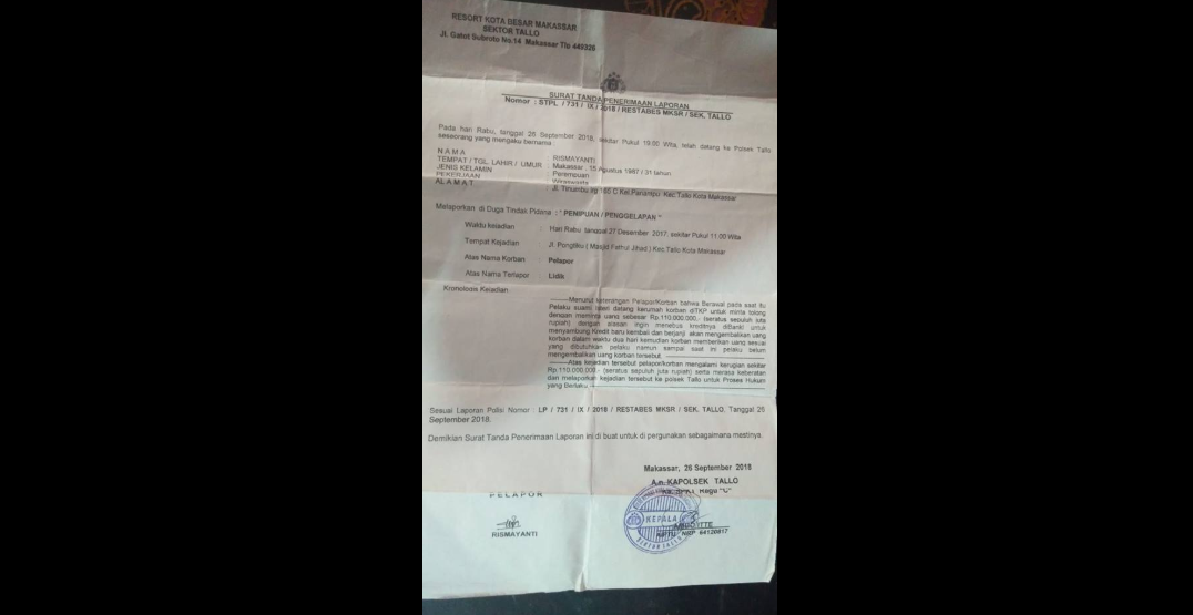 Kemudian Korban memberikan uang sesuai yang dibutuhkan Pelaku, Namun hingga saat ini pelaku belum mengembalikan uang korban tersebut. Merasa tertipu atas perlakuan pelaku, kini korban ( Rismayanti) mengalami kerugian sebesar 110.000.00 juta dan selanjutnya korban melaporkan ke pihak berwajib terkait kasus penipuan / penggelapan di Polsek Tallo, Hal tersebut berdasarkan laporan Surat tanda penerimaan laporan Nomor : STPL/731/IX/2018/Restabes Makassar/ sek Tallo.