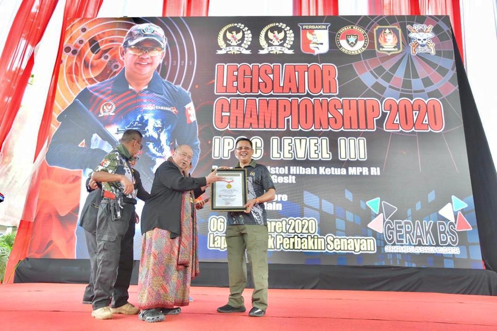 WAHANA INFOTA — Ketua MPR RI Bambang Soesatyo mendapatkan dua penghargaan dari Museum Rekor-Dunia Indonesia (MURI). Pertama, kategori Sosialisasi Empat Pilar MPR RI kepada Anggota Komunitas Motor Terbanyak. Kedua, Kejuaraan Tembak Reaksi Level III Sekaligus Sosialisasi Empat Pilar MPR RI dengan Penembak Terbanyak. Pemberian penghargaan diserahkan langsung oleh Pendiri MURI Jaya Suprana kepada Bamsoet ditengah acara Kejuaraan TembakLegislator Championship 2020.