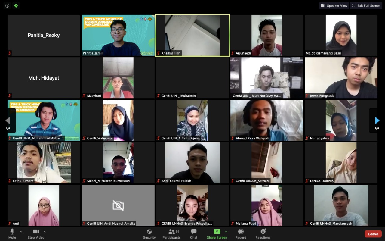 WAHANAINFOTA, Gowa – Penerima Beasiswa Bank Indonesia yang tergabung dalam komunitas Generasi Baru Indonesia (GenBI) adakan webinar belajar Design Grapich dengan mengangkat tema “Tips & Tricks Membuat Desain Promosi yang Menarik” Minggu, (23/8/2020)