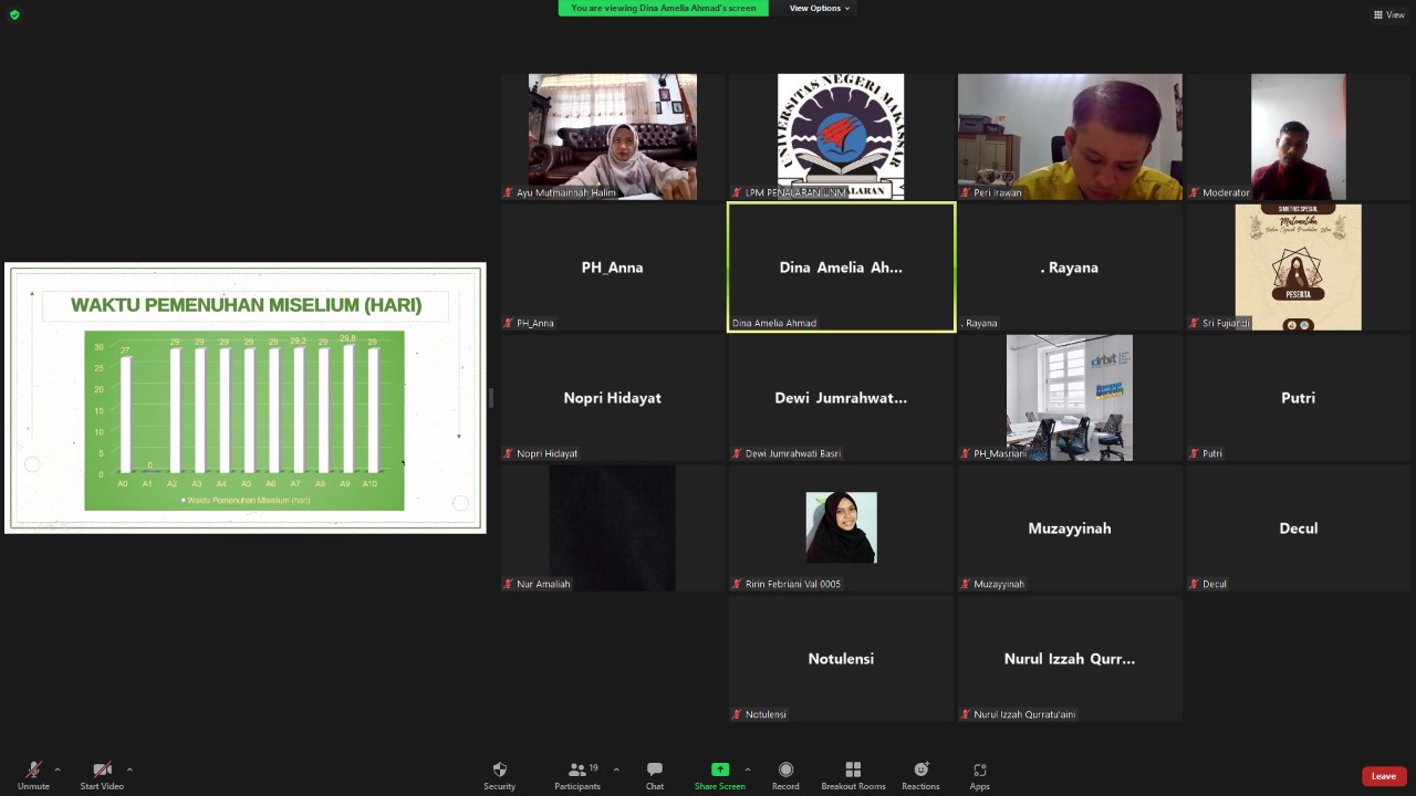 Seminar Hasil LPM Penalaran UNM kali ini dilaksanakan melalui via Zoom. Penelitian yang diseminarkan merupakan hasil penelitian Lembaga bidang Sains dengan judul penelitian Pertumbuhan dan Produktivitas Jamur Tiram Putih (Pleurotus ostreatus) Pada Variasi Komposisi Media Tanam Kulit Kacang Tanah ( Arachis hypogea) dan Serbuk Gergaji.