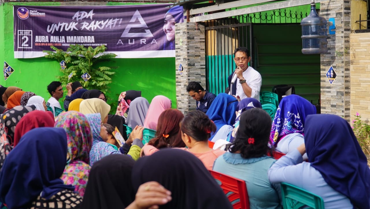 WAHANA INFOTA – Dua calon Legislatif Partai Nasdem, Aura Aulia Imandara dan Yusuf Sandy melakukan sosialisasi bersama-sama di Kelurahan Ballaparang, Kecamata Rappocini Makassar.