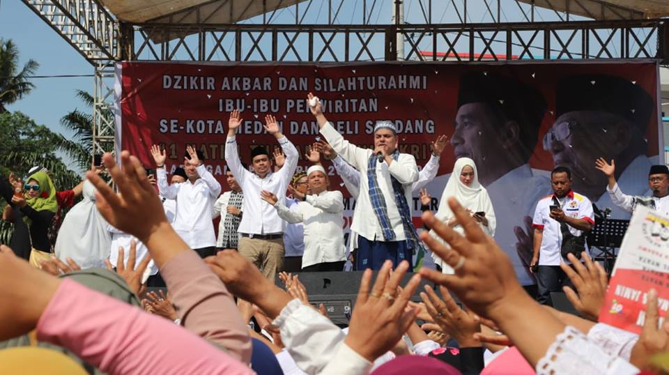 WAHANA INFOTA – Sebanyak lima ribu jamaah dari ibu ibu perwiritan se Kota Medan dan Deliserdang berkumpul di Lapangan Sepak Bola Medan Kriu, Sunggal, Deliserdang untuk melaksanakan zikir akbar dan silaturahmi bersama menantu presiden Joko Widodo, Bobby Nasution dan ustadz Hadad Alwi, Minggu (20/1/2019).