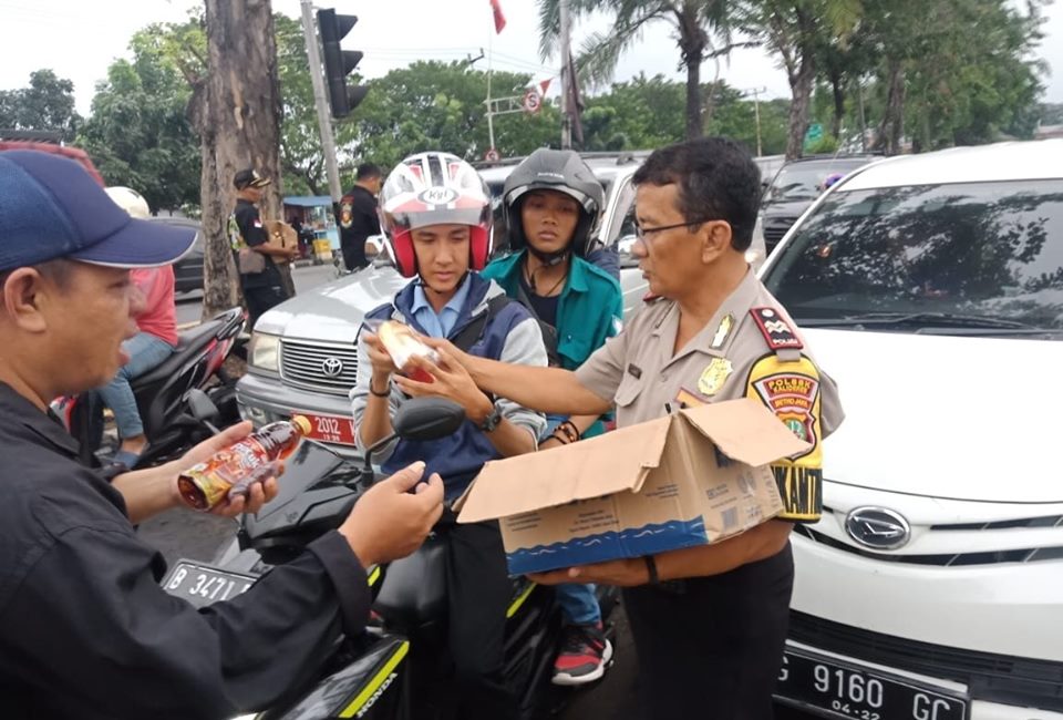 “Kita bagi-bagi takjil secara cuma-cuma ini, setidaknya kita bisa membantu masyarakat yang masih dalam perjalanan untuk sekedar makanan berbuka puasa,” ucap AKP Indra.