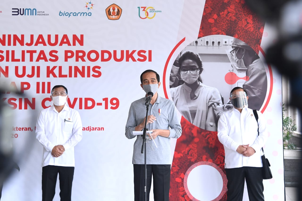 Hal itu disampaikan Presiden selepas meninjau pelaksanaan uji klinis tahap ketiga terhadap bakal vaksin Covid-19 yang digelar di Gedung Eyckman, Fakultas Kedokteran Universitas Padjajaran, Kota Bandung, Jawa Barat, pada Selasa, (11/8/2020), dengan dipandu oleh Ketua Tim Peneliti Uji Klinis dari Fakultas Kedokteran Universitas Padjajaran Prof. Kusnandi Rusmil.