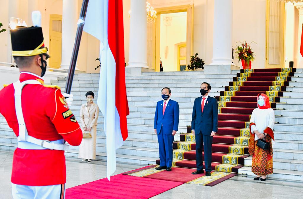 Kunjungan PM Yoshihide Suga kali ini juga merupakan kunjungan pertama seorang kepala pemerintahan ke Indonesia di masa pandemi Covid-19. Untuk itu, sejumlah penyesuaian dalam upacara penyambutan kenegaraan pun dilakukan, misalnya jumlah pasukan kehormatan yang terbatas dan dengan jarak yang lebih renggang.